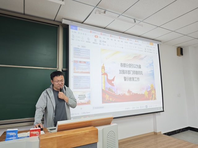 活动伊始,王龙院长强调了新时代高校教师的责任与使命,指出教师不仅是知识的传授者,更是学生成长的引路人,必须时刻以高标准要求自己,做到“学高为师,身正为范”。王龙院长带领全体教师深入学习了山西省教育厅下发的“弘扬践行教育家精神——师德建设问题”的通知,并结合教育部近年来发布的师德违规典型案例,详细解读了教师在教育教学、学术研究、师生关系等方面应遵守的行为准则。他强调,全体教师要时刻保持清醒认识,严格遵守法律法规,坚决杜绝学术不端、收受不当利益、体罚或侮辱学生等违反师德的行为。
