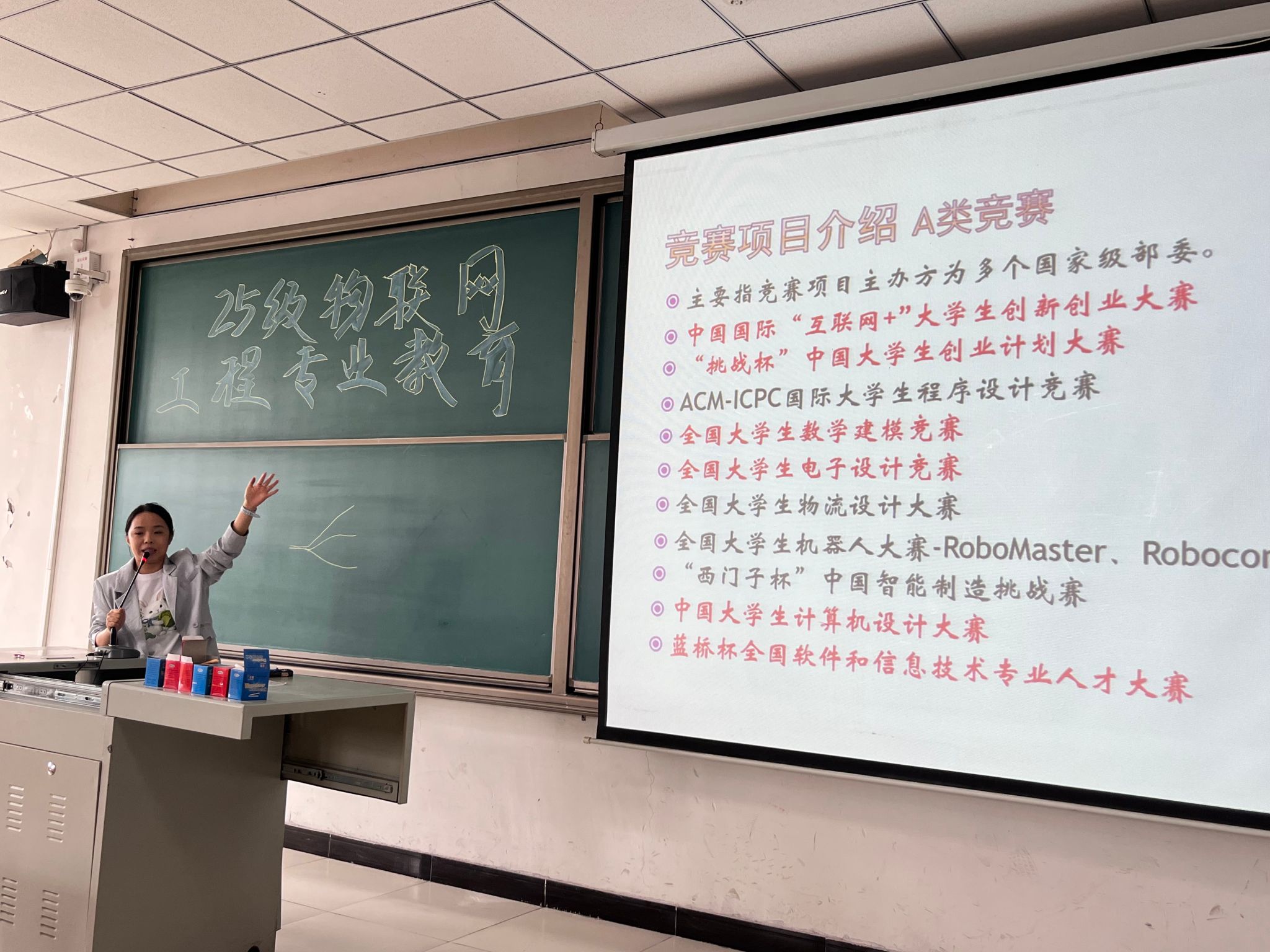 在学科竞赛环节,张苗苗老师系统介绍了“蓝桥杯”全国软件和信息技术专业人才大赛、“睿抗机器人大赛”等物联网专业相关的重要赛事。他结合往届学生的获奖作品和参赛经历,生动阐释了“以赛促学、以赛促练”的培养理念,并建议新生从大一开始注重编程基础积累,积极参与校级选拔赛,逐步提升专业竞赛能力,为未来参与高层次竞赛和项目开发打下坚实基础。