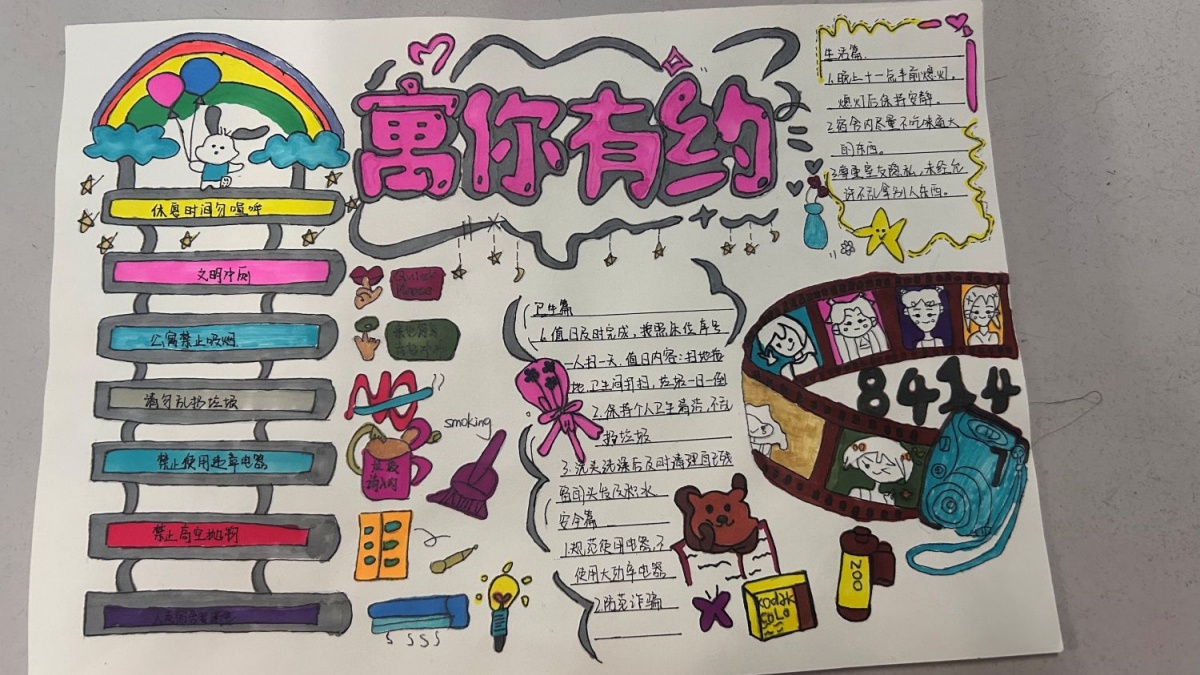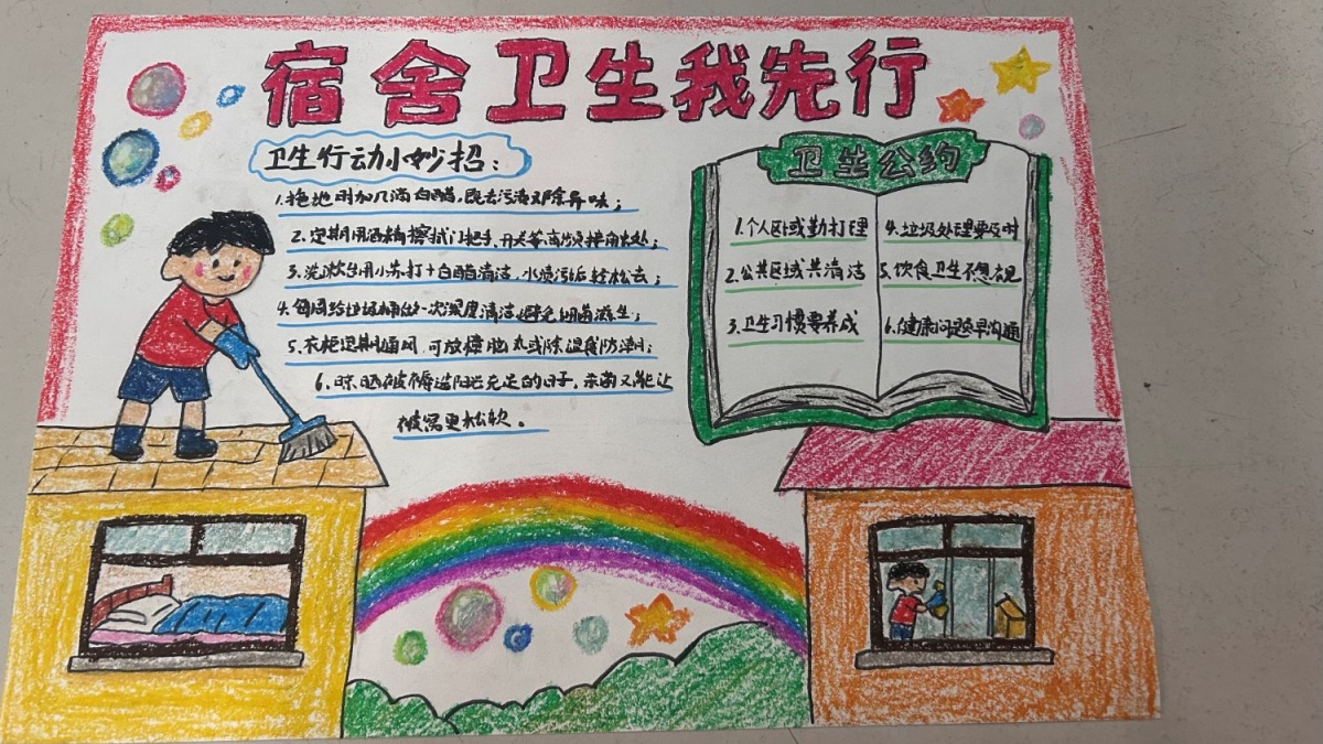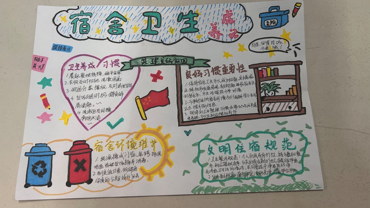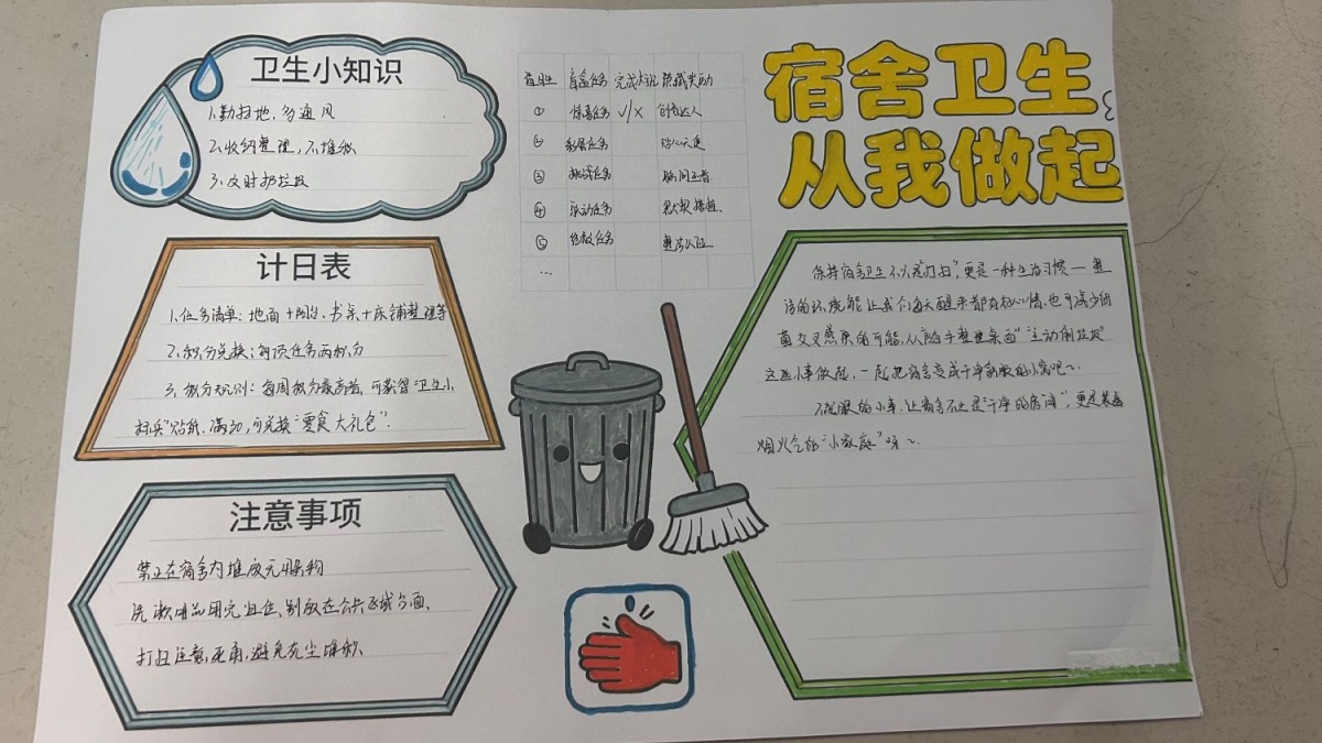 此外,活动还设置了“宿舍文明画报展示”环节。各宿舍以“清爽空间·文明同行”为主题,将整理前后的宿舍对比照片、文明小贴士、宿舍生活趣事等元素融入画报设计,通过手绘、拼贴等多样形式,生动展现了对整洁环境的追求和对文明习惯的理解。画报在活动现场集中展示时,引发了学生们的热烈讨论,大家互相借鉴整理技巧,交流文明养成心得,形成了良好的互动学习氛围。