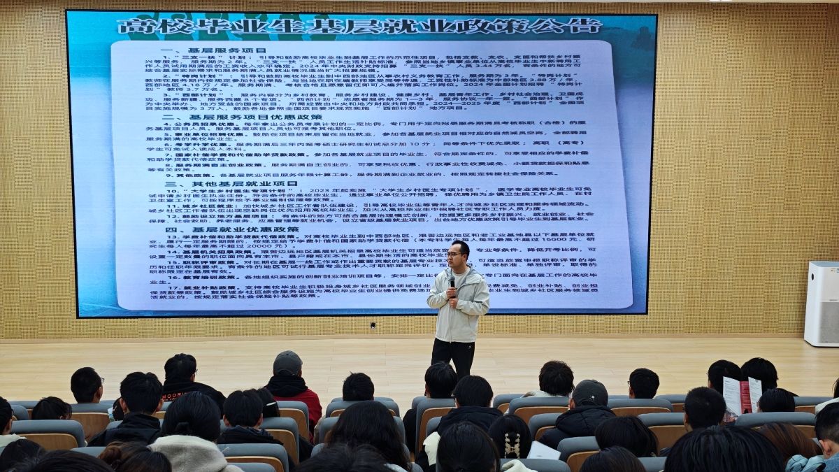 在活动形式上,刘老师创新运用“可视化就业月历”“互动问答”“政策宣讲”等多元方式,将抽象的择业理论转化为学生可感知、可操作的行动指南。全场学生专注投入,积极参与互动环节,充分展现了活动的吸引力与实效性。这种寓教于互动的形式,让职业规划的理念真正入脑入心。