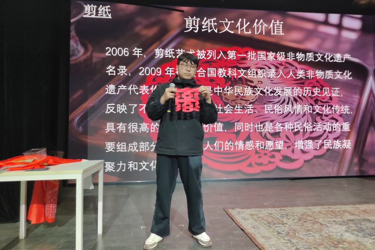 崔老师在活动开场时强调:“文化自信是一个国家、一个民族发展中更基本、更深沉、更持久的力量。在全球化日益加深的今天,坚守和传承我们的非物质文化遗产,不仅是维系民族身份和文化多样性的关键,更是增强文化自信、实现文化强国的重要途径。今天的活动,正是希望通过剪纸、戏曲、太谷饼这些非遗文化的亲身体验,让大家深刻感受到中华文化的博大精深,从而在心中种下文化自信的种子。”