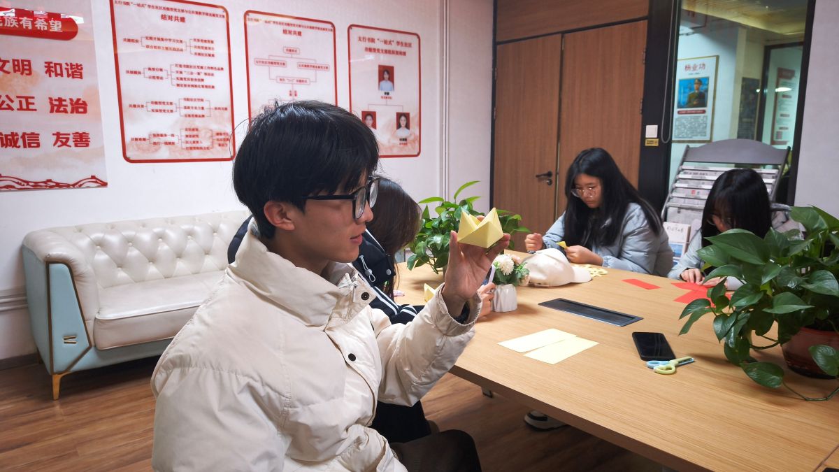 12月17日晚上,计科2401班在太行社区功能型党支部开展“指尖生花 纸韵传情”艺术实践活动,以自主剪纸触摸非遗内核。活动中,同学们将朱红宣纸对折压实,或铅笔勾勒轮廓、或凭手感直接剪裁,圆弧处手腕轻旋,细处收力慢剪,不时展纸调整完善。此次实践让非遗技艺成为青年自主创作的载体,让传统文脉在动手实践中得以触摸与延续。