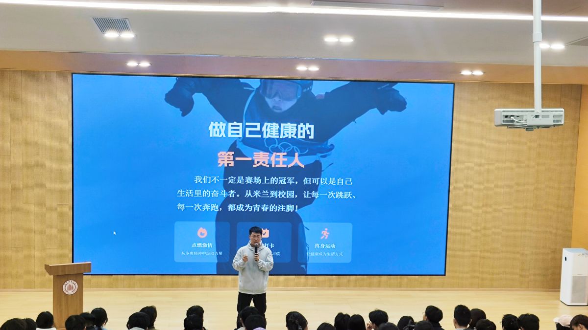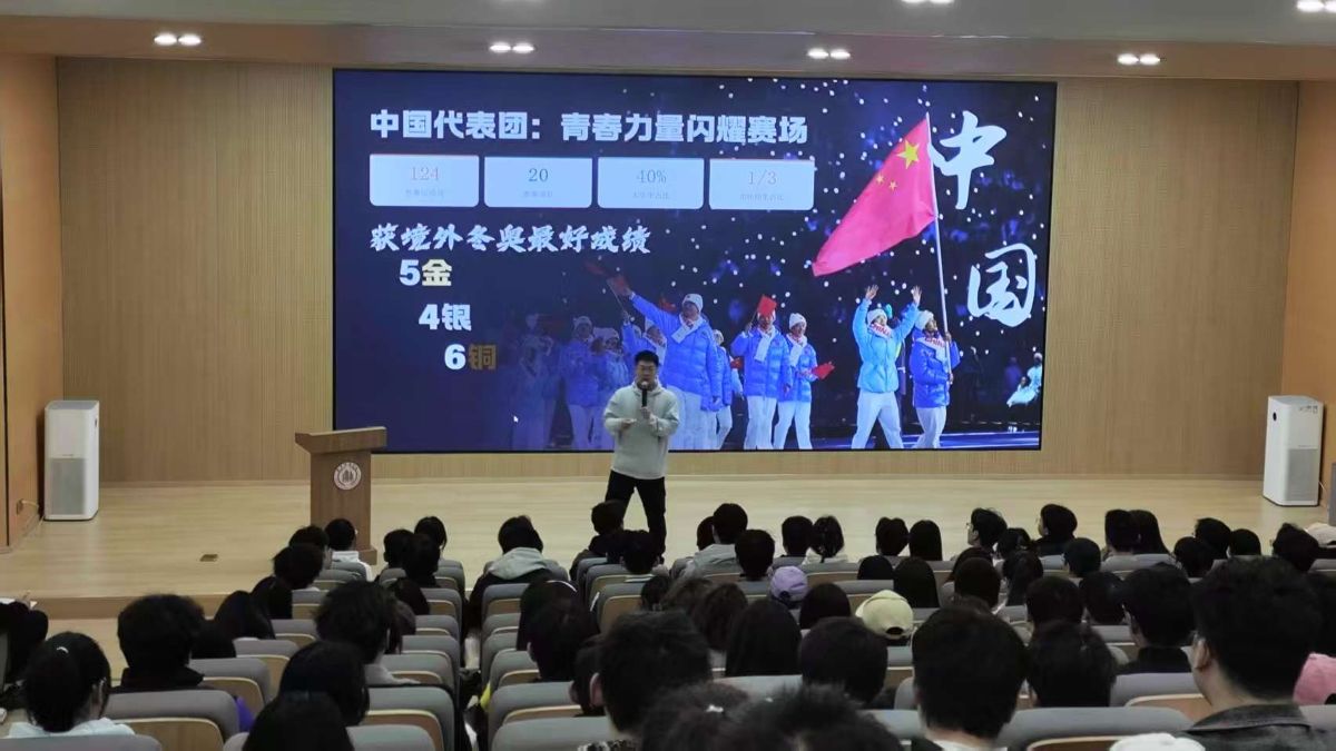 话音未落,屏幕便切换到米兰冬奥会的热血瞬间。中国代表团斩获5金4银6铜的辉煌战绩徐徐铺展,苏翊鸣带着“让国歌奏响”的信念勇夺首金,徐梦桃卫冕冠军书写传奇,宁忠岩打破奥运纪录拓宽争金版图,一个个高光时刻让全场学子热血沸腾。崔老师动情分享,从3D定制滑雪服到秒级响应的奥运AI助手,冬奥赛场上科技与热爱的碰撞,更让同学们看到了运动的无限可能。
