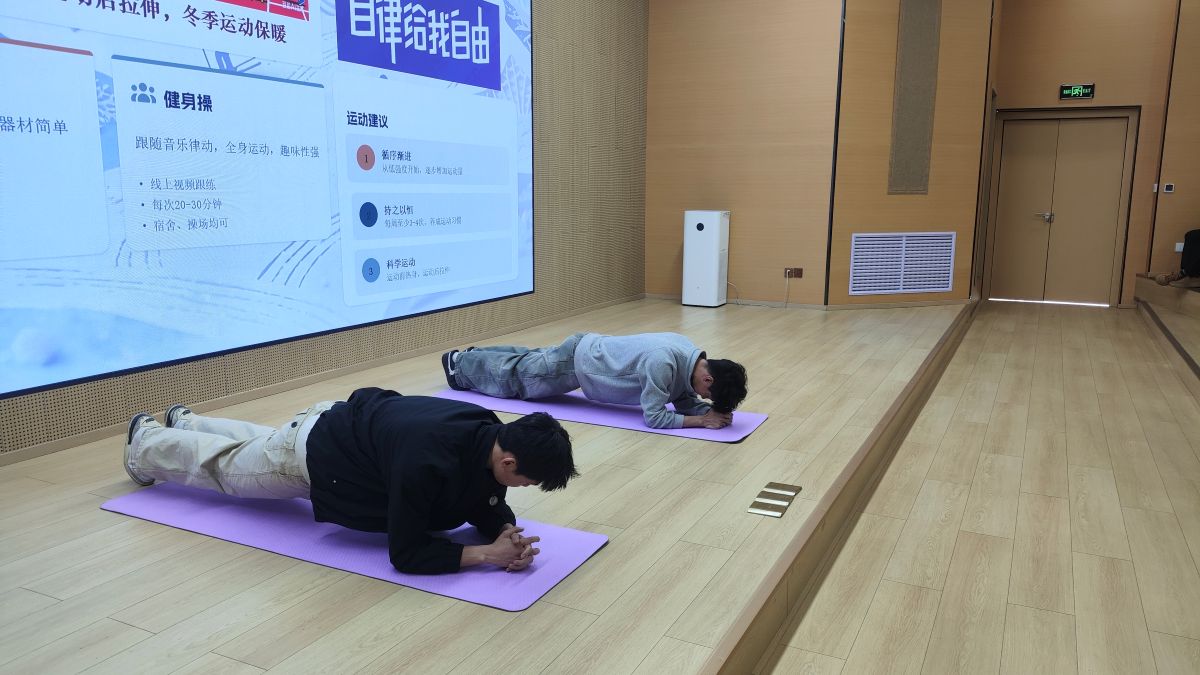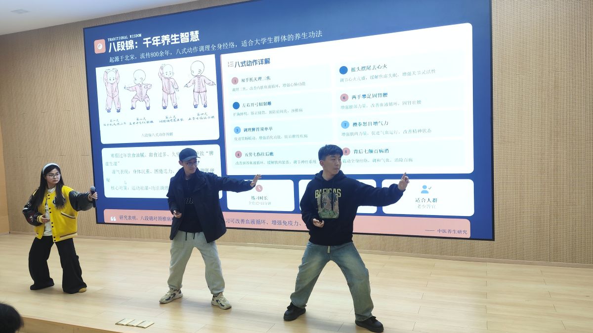现场氛围推向高潮的,是干货满满的实用运动分享环节。崔老师结合校园场景,推荐了跑步、跳绳、健身操等零门槛运动,细致拆解平衡训练、核心强化的实用妙招。邢为首的运动员们亲自上场示范动作。同时兼顾寒假期间饮食不规律引发的湿气问题,崔老师还带领大家现场学起了八段锦的基础动作,一招一式间尽显传统养生智慧。