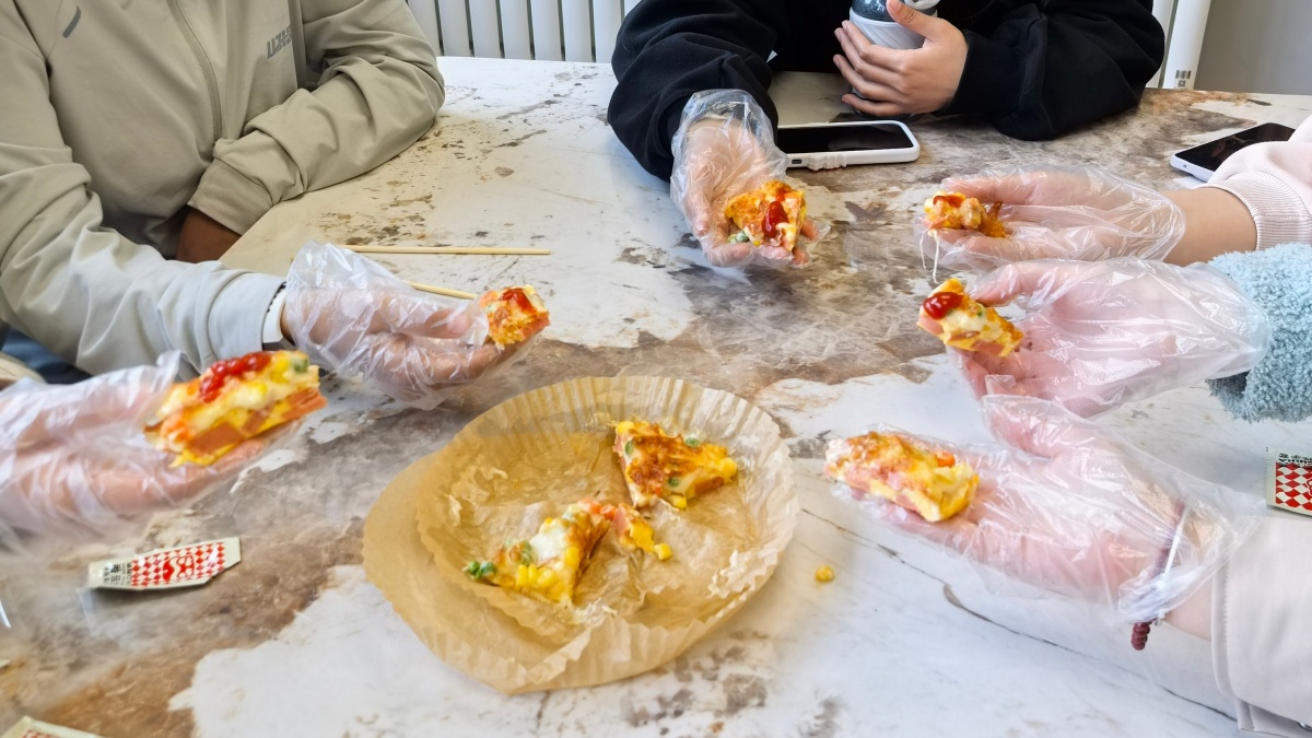 4月8日下午,物联2502班全体同学在辅导员侯老师带领下,走进上河书院菜谱工厂,以一场“烹香食味,心绽红花”创意披萨DIY活动与春日温柔相拥。侯老师一句“若饼底作画布,你们想画什么”便唤醒了满室灵感,金蛋液、红肠片、雪芝士、翠蔬丁在指尖次第铺展,顷刻间,“金色日出”的溏心卧云霞、“田园狂想曲”的七彩落画盘,寻常食材皆被点染成诗。终场合影,金灿灿的披萨映着青春脸庞,侯老师轻语作结:这一枚小小圆饼,既烤出了天马行空的美食想象,更烤暖了彼此心底的炉火。此番劳动与美育的相遇,让创意落进烟火,也让春天在每一双沾满面粉的手中,开出了鲜活的花。