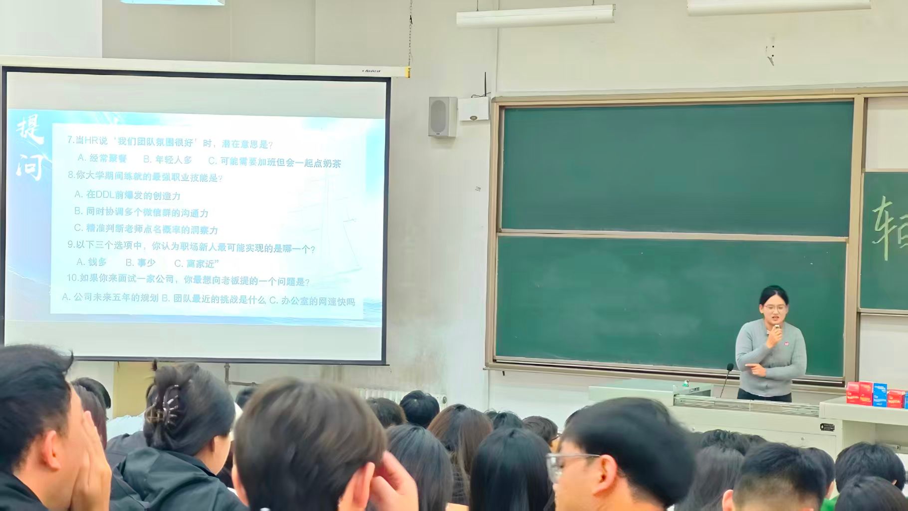 “如果‘早八’是一种职业,它的月薪应该是多少?”“当HR说‘我们团队氛围很好’,潜在意思是什么?”活动伊始,武老师抛出一连串贴近学生生活的趣味问题,瞬间点燃现场气氛。从“新媒体运营最常对设计师说的话”到“用emoji形容理想工作状态”,同学们踊跃举手,答案或幽默调侃、或认真思考,在轻松互动中悄然拉近与“职场”的距离。当被问及“大学期间练就的最强职业技能”时,有同学笑称“精准判断老师点名概率的洞察力”,也有同学坦言“在DDL前爆发的创造力”,武老师借此点评:“这些看似调侃的‘技能’,实则暗藏职场必备的应变力与执行力,关键在于将其转化为专业能力。”