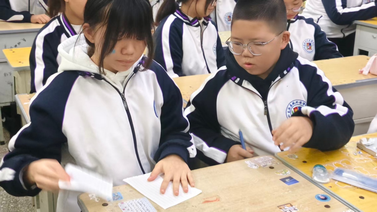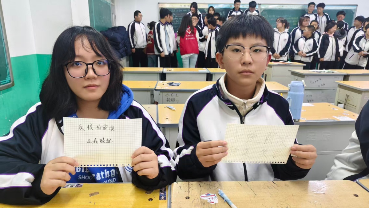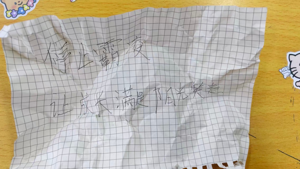 “大家拿出准备好的纸张,根据你听到的话语对你的伤害程度来揉纸团”,随着“你自己矫情,怪我们喽?”“我们只是开个玩笑而已,至于么!”这些话语的播放,同学们手中的纸皱成一团。“同学们,即使有道歉,褶皱的纸团也永远变不回平整的样子。拒绝言语暴力,不要做那个揉纸团的人”,在志愿者的引导下,同学们打开手中的纸团写下反校园霸凌的暖心话语,勇敢对校园霸凌说不。