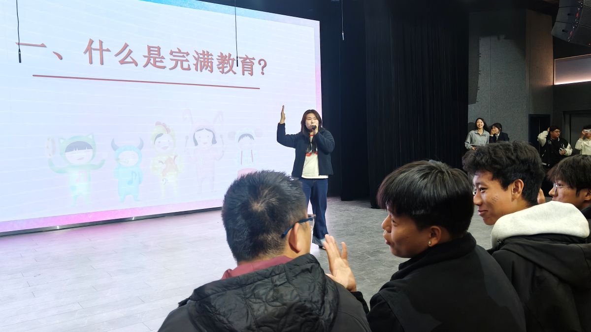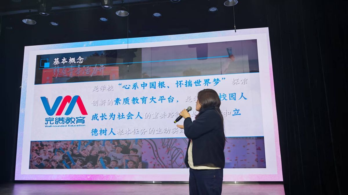 “我理解大家的困惑,但我想告诉大家完满教育不是简单的活动叠加,而是一套完整的育人体系。”王老师化身 “完满教育解说员”,为大家层层拆解其内涵。“完满教育是‘心系中国根、怀揣世界梦、探索创新的素质教育大平台’,源于梁启超 ‘开民智’与赫伯特・斯宾塞‘教育为未来完满生活做准备’的理念。”完满教育“源于第二课堂却高于第二课堂”,活动更丰富、体验更深刻。“我们的活动涵盖社团活动、志愿服务、艺术实践、竞技体育。每周三、周五下午的 ‘完满时间’,可通过‘指尖派’一键报名参与活动,当下的每一次参与都是在点亮一项未来的 ‘隐藏技能’。”